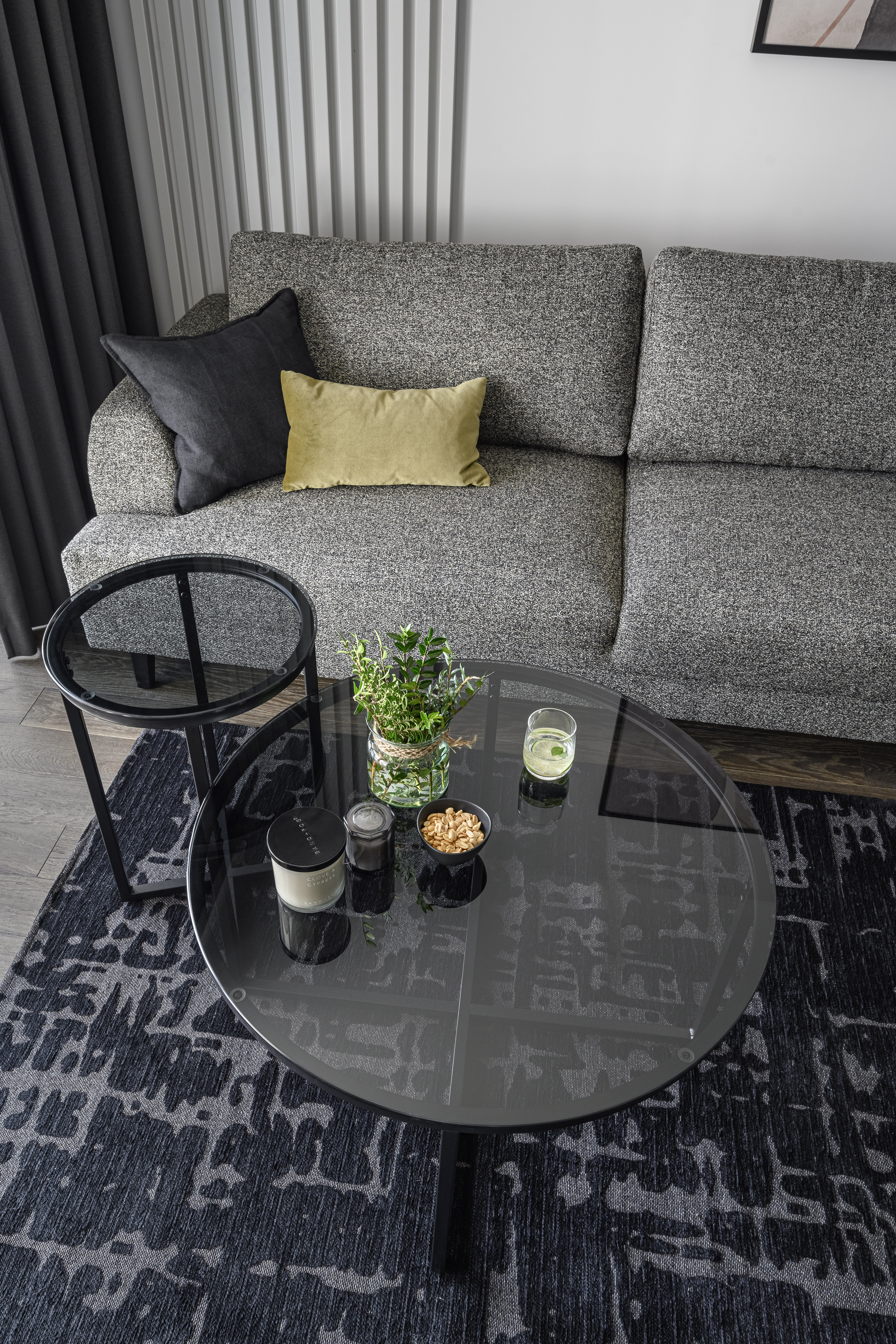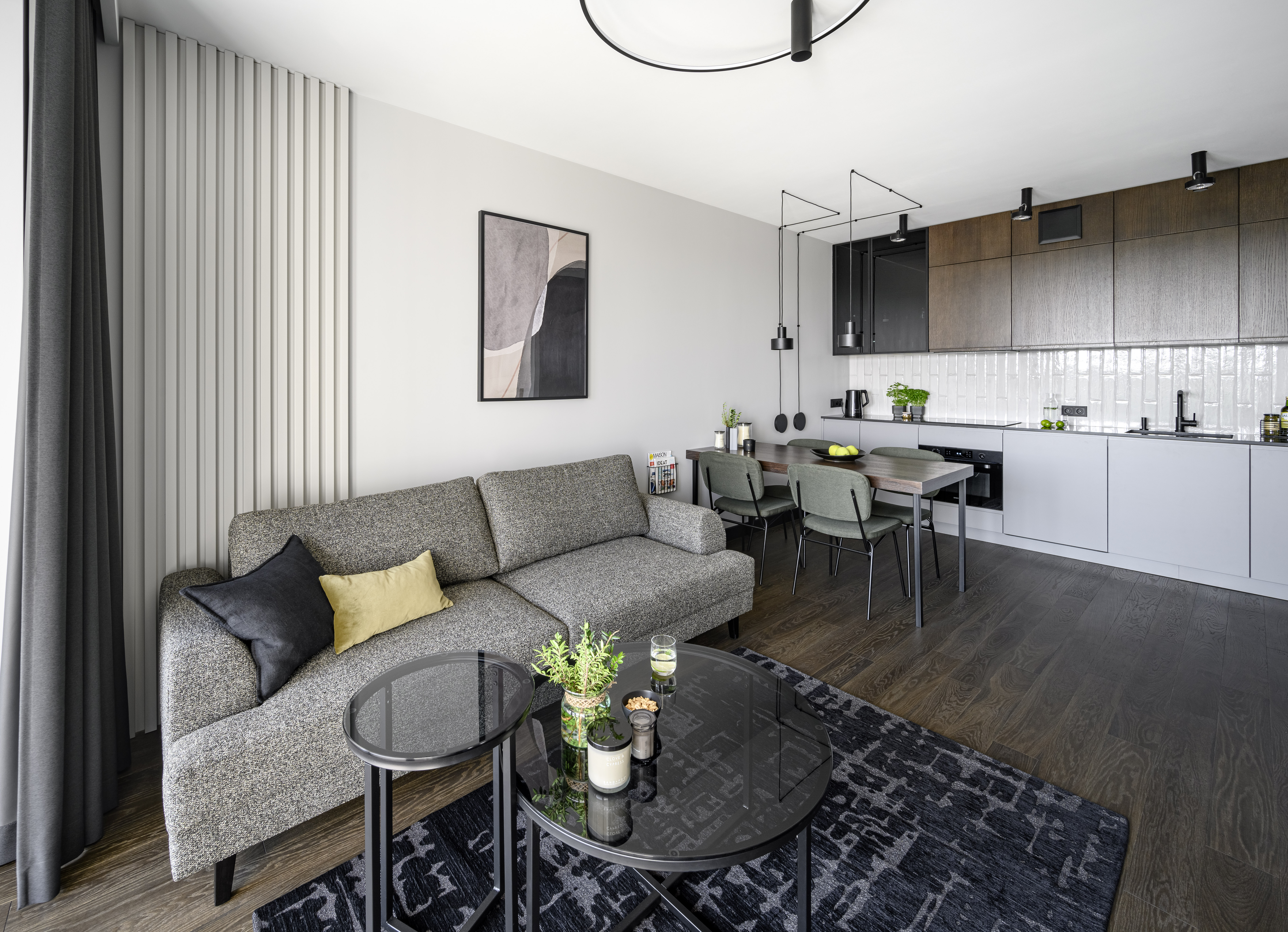 Zostały wykonane na specjalne zamówienie, z dbałością o każdy detal. Ich stonowana, szara kolorystyka idealnie współgra z estetyką apartamentu, tworząc eleganckie i przyjemne w użytkowaniu wnętrze.
